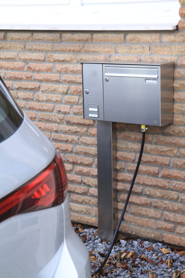 Besonders kreativ und ausgefallen: Der Kunde hat seine cFos Power Brain Wallbox in einen abschließbaren Briefkasten einbauen lassen. Der Power Brain Controller wurde außerhalb der Wallbox im Zählerschrank verbaut. Der Briefkasten ist von der Firma Renz und vollständig aus Edelstahl, um Korrosion zu vermeiden und die Komponente der Wallbox vor Nässe zu bewahren. Weiterer Schutz ist durch ein kleines Edestahl-Dach gewährleistet.