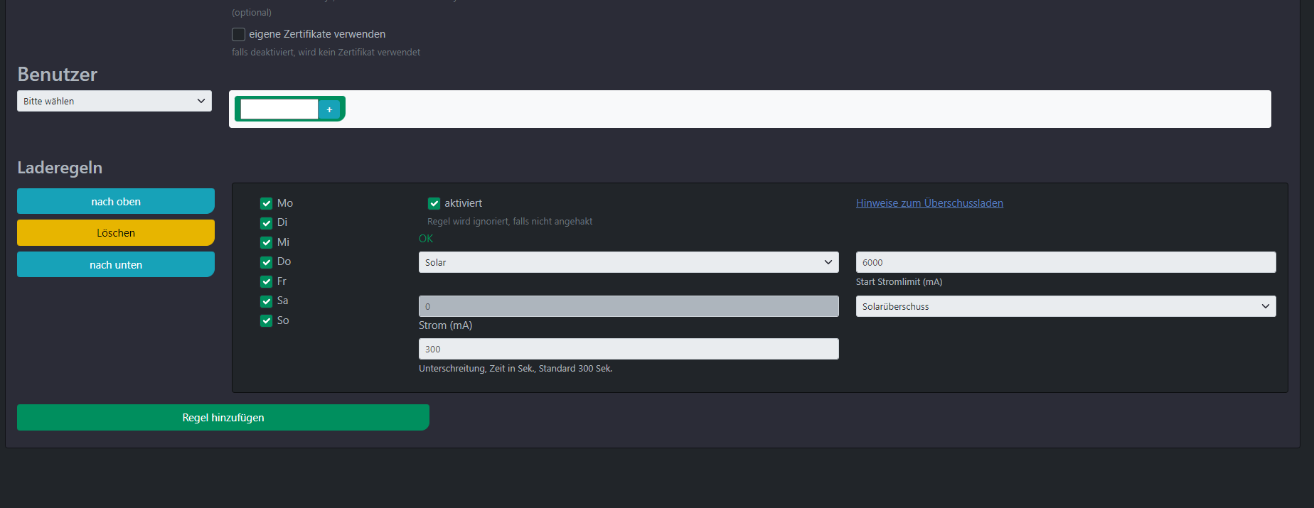 Ich hab jetzt noch nicht genau geschaut, aber du hast in der Wallbox noch genutzte Phasen L1 L2 L3 stehen. Stell das Mal auf L1 und teste.