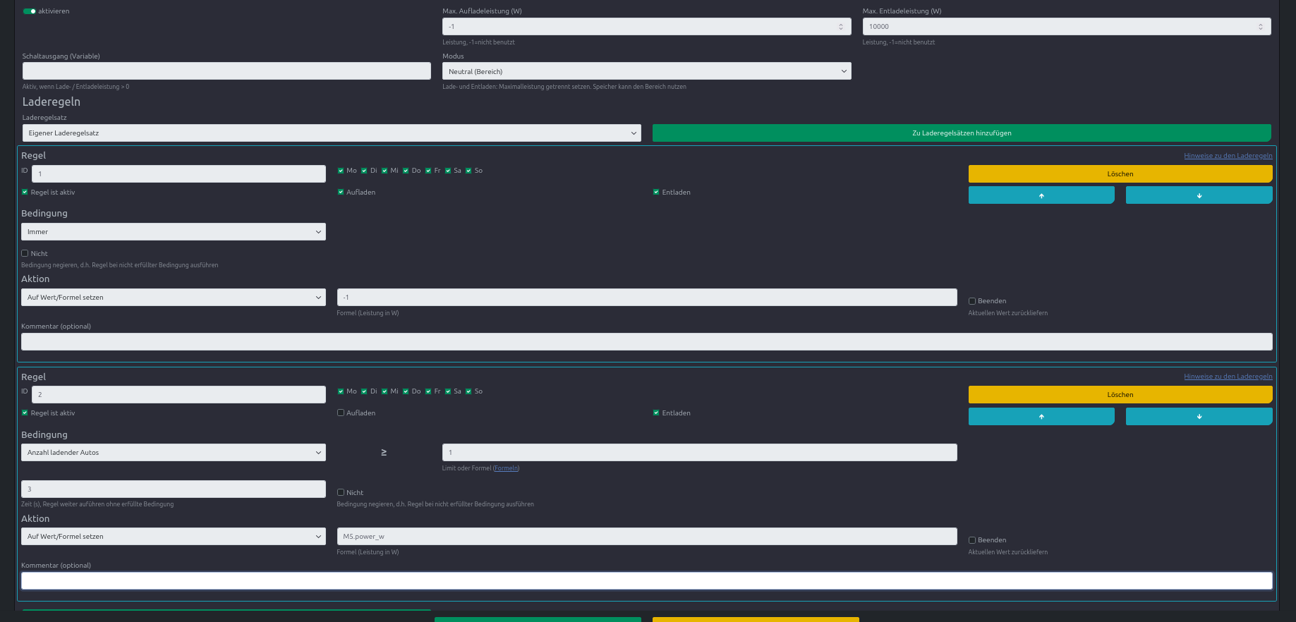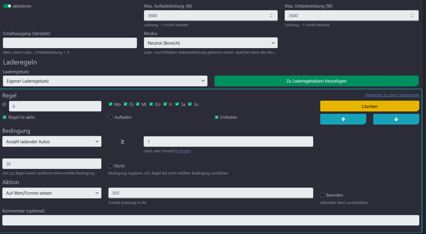 Hallo zusammen, ich versuche die Entladeleistung des Batteriespeichers beim Laden des Autos auf 500W zu begrenzen. Die Betteriekonfiguration besteht aus: Anbei die Einstellungen für die Batterie und -steuerung und die Regel, die die Entladeleistung auf 500W begrenzen soll. Leider funktioniert sie nicht. WO liegt der Fehler?