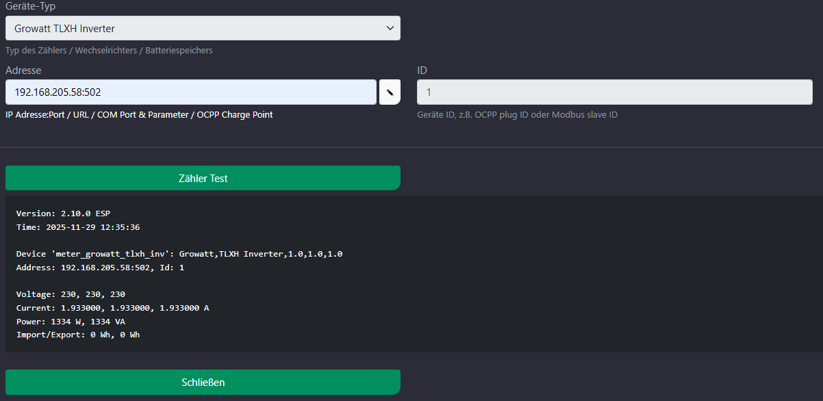 Hallo, ich versuche eine Modbus-TCP-Verbindung zwischen der cfos-Brain Wallbox und meinem Growatt MID 15KTL3-XH herzustellen. Für die Wandlung RTU zu TCP nutze ich einen RTU-TCP-Gateway. Ich benutze dieses momentan um Daten aus dem WR auszulesen und meine Haussteuerung zur übertragen ( eine Siemens S7-1200). Das funktioniert auch. Ich habe die Zählerdefinitionsdatein aus diesem Forum in die Wallbox geladen und wenn ich einen Zähler anlege und den Zählertest durchführe bekomme ich auch teilweise Werte zurück, die stimmen aber nicht. Die Register sind aber scheinbar korrekt. Kann mir da jemand weiterhelfen?