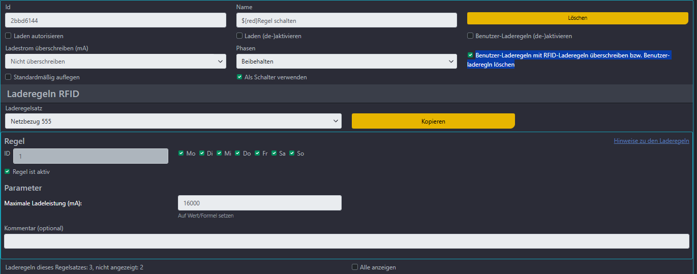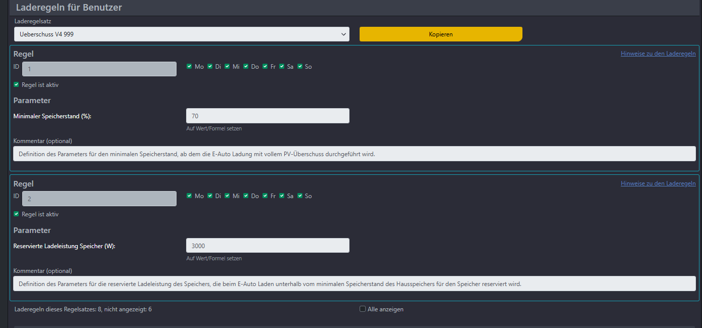 Prinzipiell kann ich dir sagen, dass der Laderegelsatz für deinen Alltag/Standard Modus beim Benutzer direkt angehangen werden müssen. Alle Sonderfälle, die du über RFID triggern willst, musst du bei dem Benutzer dann unten an einen RFID Chip binden und die jeweiligen Laderegelsätze dann dort anfügen. Dabei dann "Benutzer-Laderegeln mit RFID-Laderegeln überschreiben bzw. Benutzerladeregln löschen" auswählen. Keine Laderegeln direkt in der Wallboxkachel anlegen würde ich sagen. Batteriesteuerung würde Sinn machen über einen entsprechenden Laderegelsatz in der Batteriekachel anzulegen. Hier könnte man aber auch die Regellogik an sich in den Laderegelsätzen im Benutzer, bzw. RFID einarbeiten und eigene Chargingmanager Variabeln beschreiben, die dann in der Batteriesteuerung nur noch abgefragt werden. Hier hast du eben eine Logik-Aufgabe und weniger eine Systemabhängige Problemstelle. Da musst du dir einmal deinen Fall systematisch durchgehen und eine passende Logik entwickeln.