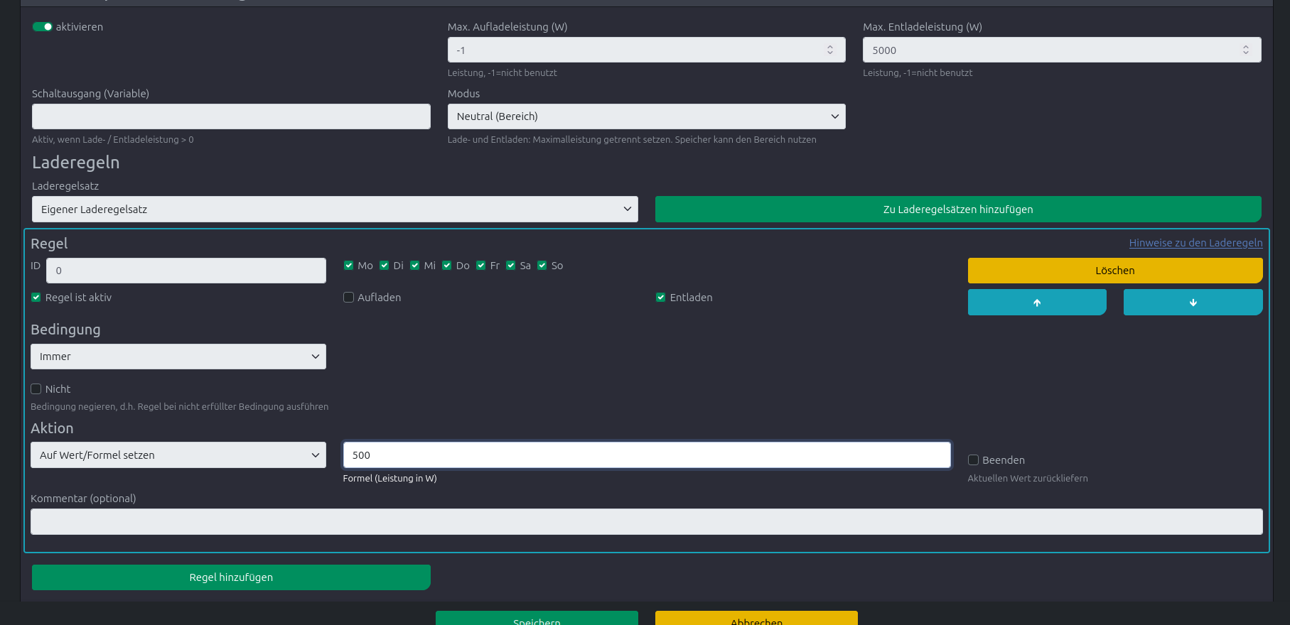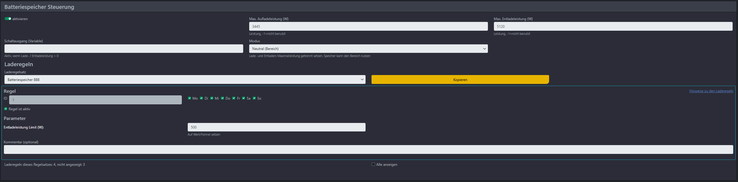 Die max. Auflade- und max. Entladeleistung hast du gesetzt. Das ist richtig! Die wird immer dann gesetzt wenn alle Regeln "false" sind. Dafür muss aber aber min. eine Regel geben. Gibt es keine Regel, wird auch nichts gesetzt.