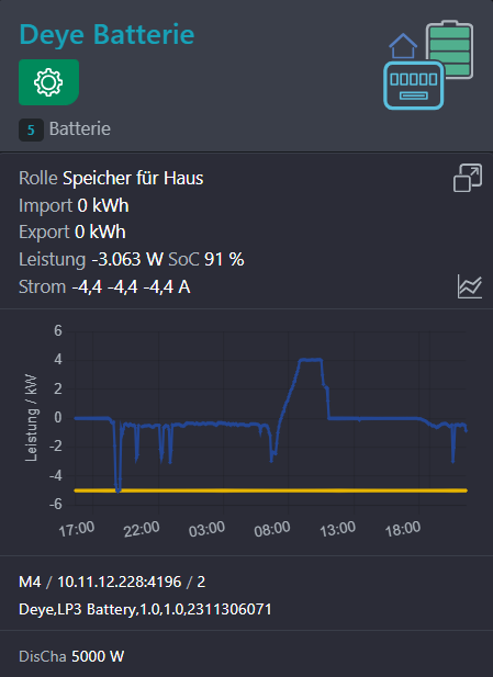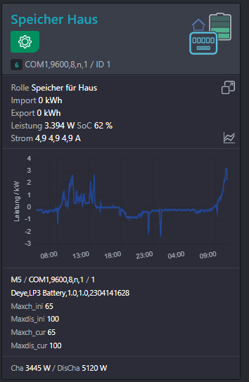 Ich habe meinen Deye über einen Waveshare rs485 to eth angebunden und spreche ihn über die IP von diesem an. Das ist vielleicht unerheblich, aber was ich ich in den json von euch gefunden habe, dass dort direkt das Modbusregister angesprochen wird. Das ist ja wichtig, um z.B. der Hausbatterie zu sagen, dass sie nur z.B. 5000 W entlädt. So habe ich es verstanden.