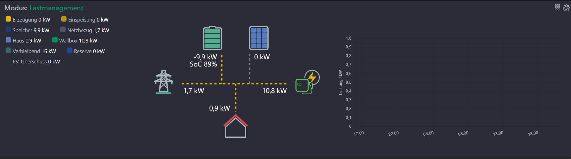 Wird der RFID-Chip angelegt, dann wird auf Netzbezug umgeschaltet und mit 16 A (11kW) geladen. Für den Fall, dass die Speicherleistung des Hausspeichers dann negativ ist, also entladen wird, und die Leistung des E-Autos positiv ist, also geladen wird, wird die Speicherleistung auf 500 W reduziert. Dieser Wert ist anpassbar - für uns entspricht das in etwa dem durchschnittlichen Hausverbrauch tagsüber. Hat man einen separaten Modbus-Zähler für die Hauslast, den man hinter den Load-Ausgang des Deye schalten würde, könnte man die Entladeleistung des Speichers genau an der Hauslast laufen lassen. Da die Hauslast ohne einen solchen Zähler allerdings durch die Bilanz der Wallbox ermittelt wird, funktioniert die Regelung nicht/ungenügend gut.