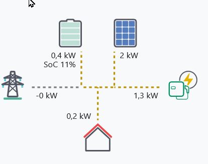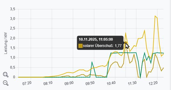 Der Test heute hat noch nicht das erhoffte Ergebnis gebracht. Wenn der Überschuss den Minimalstrom überschreitet, dann wird er nicht abgerufen, sondern geht stattdessen in die Hausbatterie und andererseits wird sogar zeitweise abgeschaltet, was gar nicht passieren sollte.