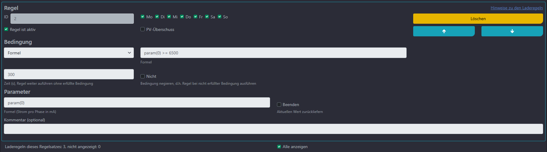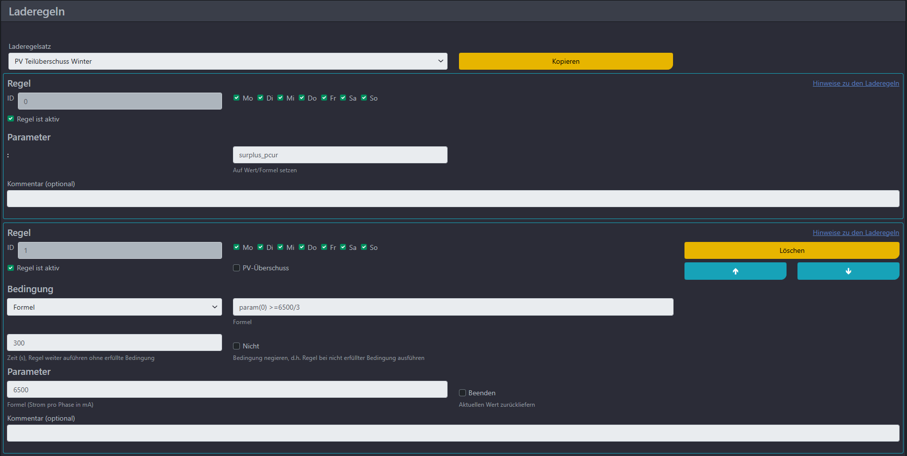 Bei dem Regelsatz von Driller dürfte die Ladeleistung in Regel 2 nicht ausreichen, weil die meisten Fahrzeuge einen Mindeststrom von 6000mA benötigen. Deshalb hatte ich diese modifiziert.