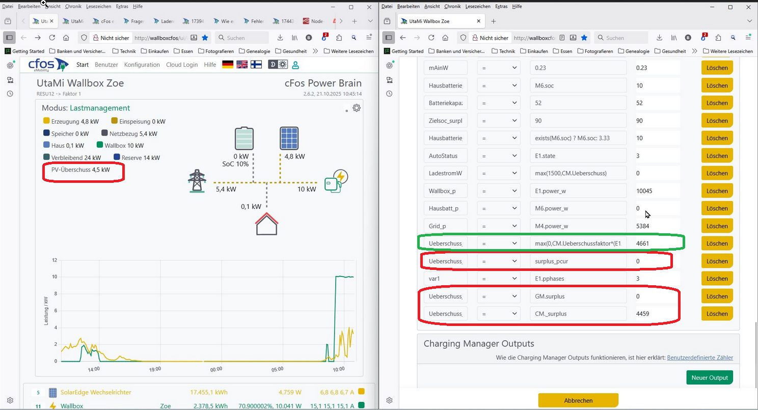 Ich benutze eine eigene Formel für den Überschuss, weil ich meine Hausbatterie nicht steuern kann: max(0,CM.Ueberschussfaktor*(E1.power_w+M6.power_w-M4.power_w)) 1 Wallbox Hausbatt. Grid Bei mir weichen die Werte für CM._surplus von meinem berechneten Ueberschuss_W ab, obwohl beide doch
