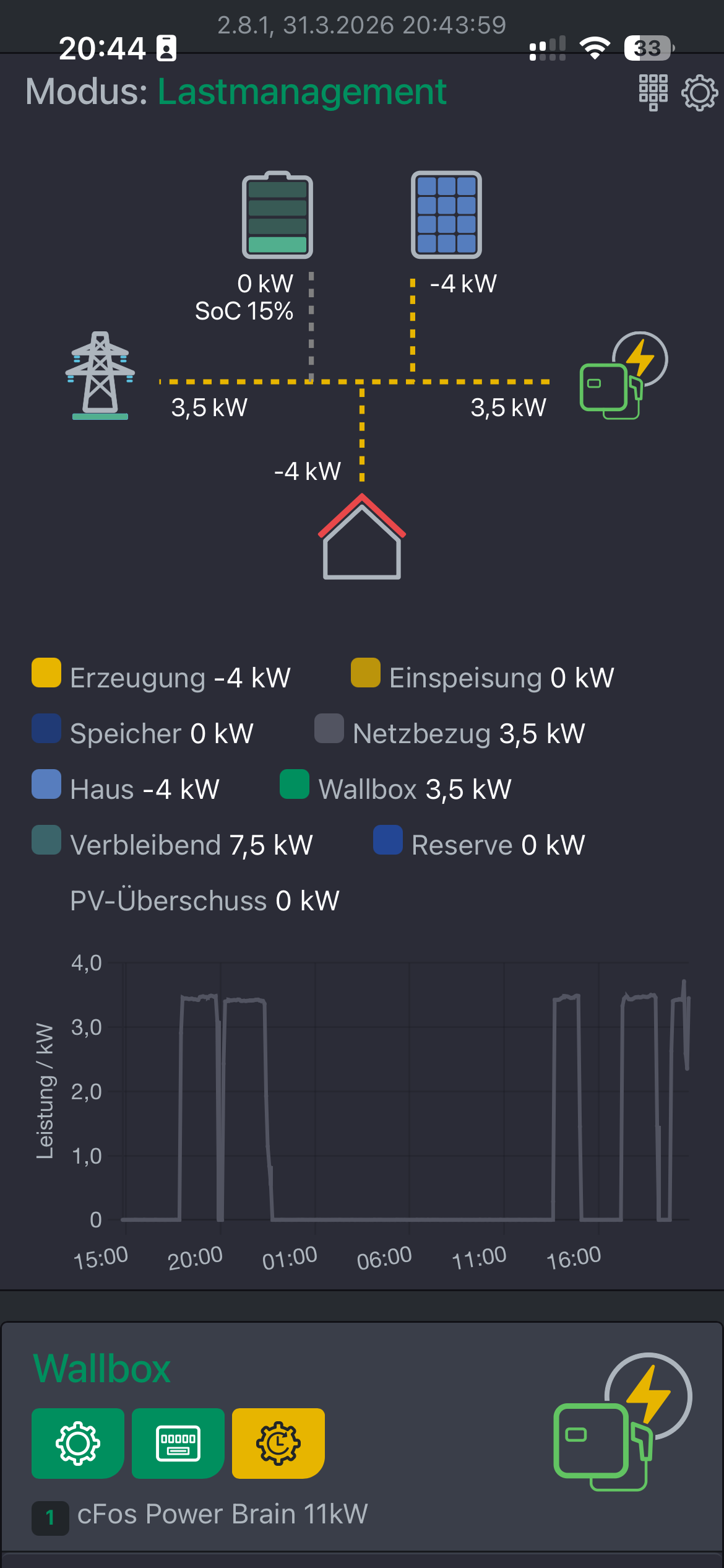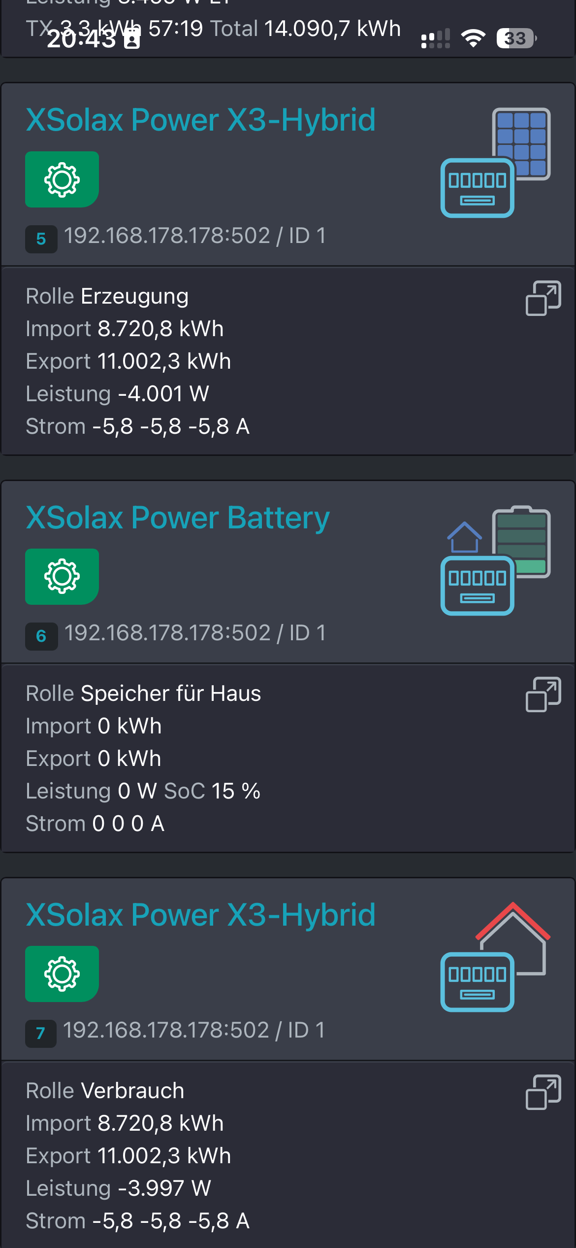 Hallo zusammen, ich habe mir von @Geotec die beiden json-Dateien für die Konfiguration von Solax Hybrid und Batteriespeicher eingespielt. Das hat auch wunderbar funktioniert und es kommen auch Werte in der CFos an. Nur egal welche Rolle ich dem Hybrid gebe, passen die Werte für Netzbezug, Verbrauch nicht. Siehe Screnshot. Der Netzbezug ist immer die Last von der Wallbox. Die Wallbox ist auf Verbrauch Laden Auto gestellt. Was mache ich falsch?
