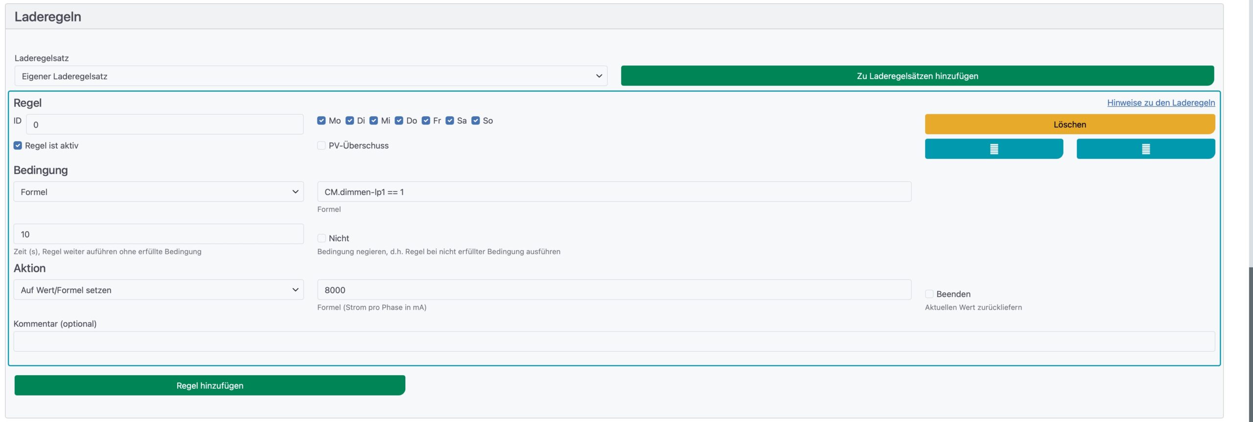 Hi alle, hi geotec, danke für den Input. Meine einfach Regel läuft leider nicht. Hat jemand eine Erklärung was falsch ist? Die Variable dimmen ist angelegt. Auf die kann ich über die API schreiben. Ich möchte im ersten Schritt jeden einzelnen Ladepunkt separat ansteuern. Erst mit einem festen Wert, später mit einer Variable oder dem Ergebnis einer weiteren Regelung. Vielen Dank und viele Grüße Jens markiert als Spam