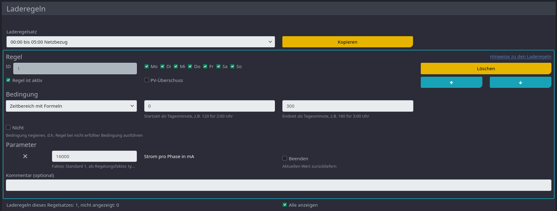 Hallo, ich dachte das muss doch ein Kinderspiel sein – ist es aber offensichtlich nicht. Ich habe die Power Brain in einer verschlossenen Garage, benötige also keine Benutzer / RFID Authentifizierung. Mein Stromtarif ist dynamisch und ich habe regelmäßig den günstigsten Strompreis zwischen 00:00 und 05:00 Uhr. Zunächst habe ich es mit der Bedingung „Uhrzeit“ versucht und nun auch mit „Zeitbereich mit Formeln“. Das ganze im Setup des Lastmanagements, nicht unter einem Benutzer (ich habe keine Benutzer definiert). Das Ziel ist jedes ggf. angesteckte Fahrzeug in diesem Zeitraum möglichst dreiphasig zu laden. Nur mit dieser Regel funktioniert das jedenfalls nicht. Unter Start sehe ich das Pausenzeichen, die Regel scheint also aktiv zu sein, aber geladen wird nicht. Was übersehe ich?