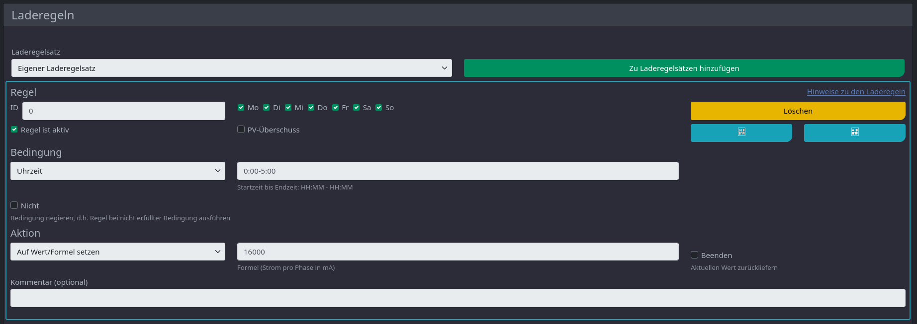 Hallo, ich dachte das muss doch ein Kinderspiel sein – ist es aber offensichtlich nicht. Ich habe die Power Brain in einer verschlossenen Garage, benötige also keine Benutzer / RFID Authentifizierung. Mein Stromtarif ist dynamisch und ich habe regelmäßig den günstigsten Strompreis zwischen 00:00 und 05:00 Uhr. Zunächst habe ich es mit der Bedingung „Uhrzeit“ versucht und nun auch mit „Zeitbereich mit Formeln“. Das ganze im Setup des Lastmanagements, nicht unter einem Benutzer (ich habe keine Benutzer definiert). Das Ziel ist jedes ggf. angesteckte Fahrzeug in diesem Zeitraum möglichst dreiphasig zu laden. Nur mit dieser Regel funktioniert das jedenfalls nicht. Unter Start sehe ich das Pausenzeichen, die Regel scheint also aktiv zu sein, aber geladen wird nicht. Was übersehe ich?