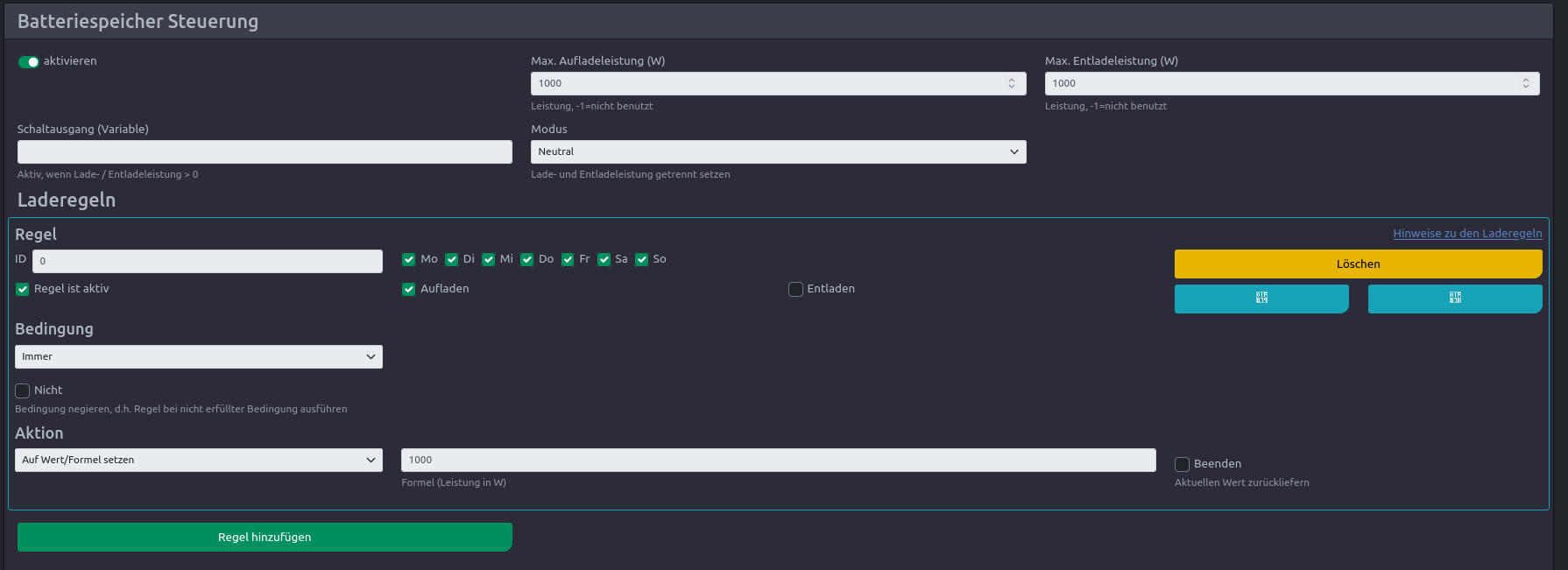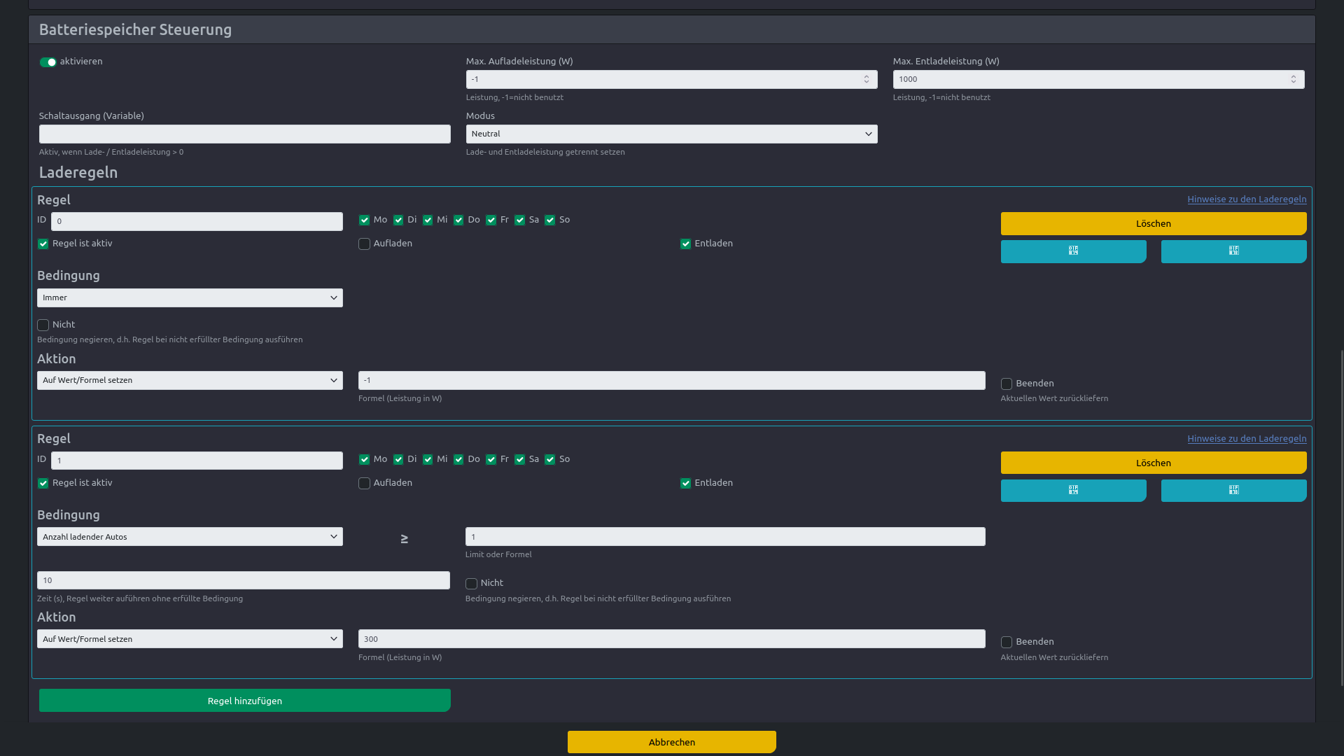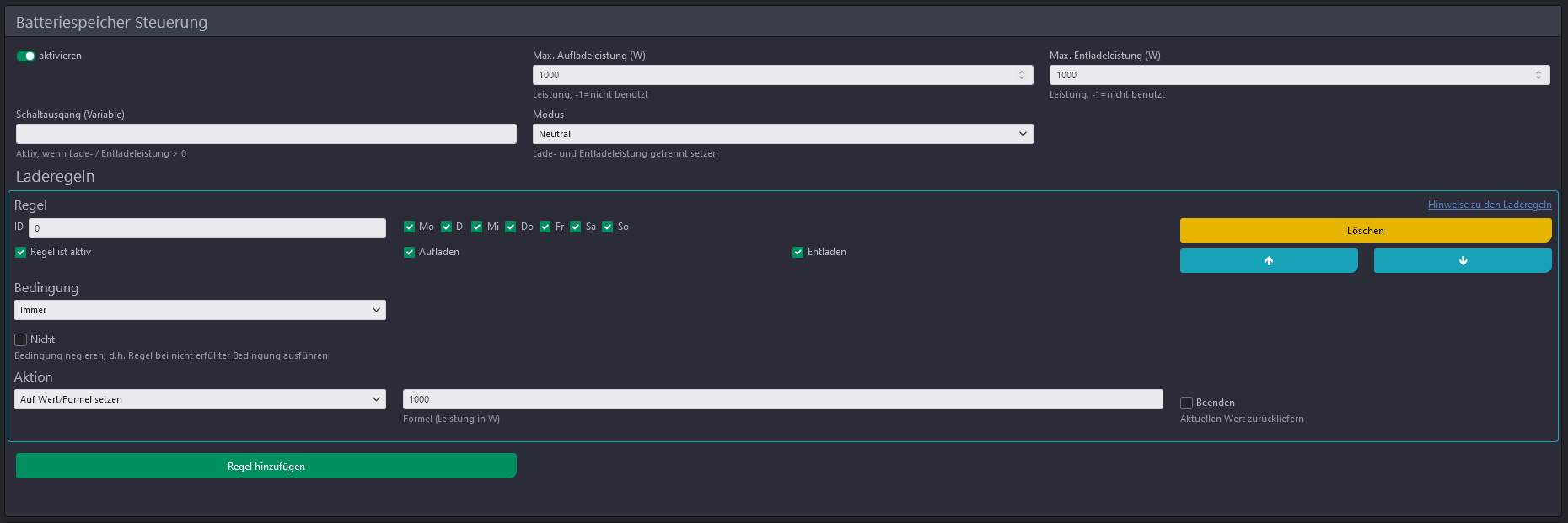 Hallo, im Anhang noch mal Zählerdefinitionen. Ich habe die Leistung in der inv angepasst. Außerdem habe ich zum testen eine Bat_st erstellt wo eine Akkusteuerung eingebaut ist. Vielleicht könntet ihr die auch mal testen. Dazu die Steuerung einschalten und wie im Screenshot eine einfache Regel erstellen. Dann sollte der Akku mit 1000W laden bzw entladen. Die Laderegel mit dem SOC des Autos würde funktionieren, wenn du den SOC irgendwie in die Wallbox bekommst. Bei der anderen bin ich unsicher. Da muss ich mal drüber nachdenken. markiert als Spam