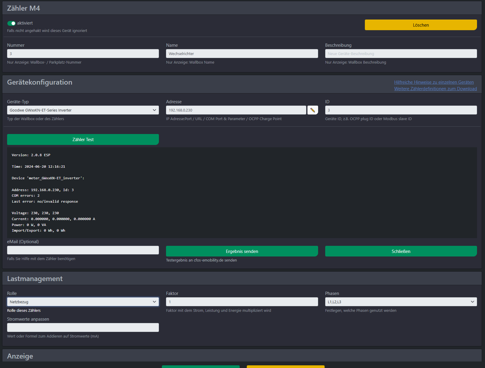 Ich habe mir diesen Thread nun vollständig durchgelesen, bekomme aber meinen Wechselrichter nicht in den Charging Manager integriert. Die fünf GoodWe Zählerintegrationen habe ich in den ChargingManager hochgeladen. Es kommt die Fehlermeldung "no/invalid response" beim testen. Anbei ein paar Screenshots. Mache ich grundlegend etwas falsch? Im Browser auf dem Desktop wird mir auch nur mein Wechselrichter angezeigt, in der App / Smartphone Browser sehe ich auch die Wallbox und den S0 Zähler. Die Integration des Wechselrichters in Homeassistant hat problemlos geklappt... Beste Grüße markiert als Spam