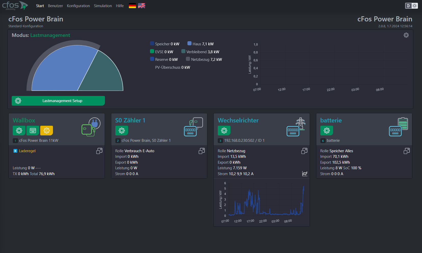 Hallo, umschalten der Laderegel kann man mit einer Pin oder einer RFID-Karte machen. Dazu müssen die Laderegeln in der Benutzerverwaltung angelegt werden. Hier findest du ein Beispiel: https://www.cfos-emobility.de/network/antworten/wie-kann-ich-unter-einem-benutzer-mehrere-ladezezarien-auswaehlen/ Für die Akkusteuerung hänge ich dir die Regeln an. Diese kann man einfach importieren und dann in der Speicher-Kachel auswählen.