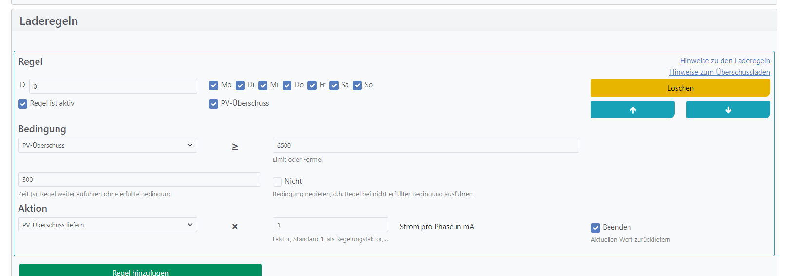 Hallo Geotech, danke für die Hilfe. Ich habe versucht das PV-Überschussladen (noch ohne Batteriesteuerung) umzusetzen. Leider bisher ohne Erfolg, das PV-Überschussladen wird trotz aktiver Regel nicht getriggert. Habe ich hier etwas falsch konfiguriert? Ich erzeuge derzeit ~7,1 kW, diese werden aber als Verbrauch Haus deklariert, nicht als erzeugter Strom. Muss ich hier die Phaseneinstellungen ändern? Falls ja, woher weiss ich diese? markiert als Spam