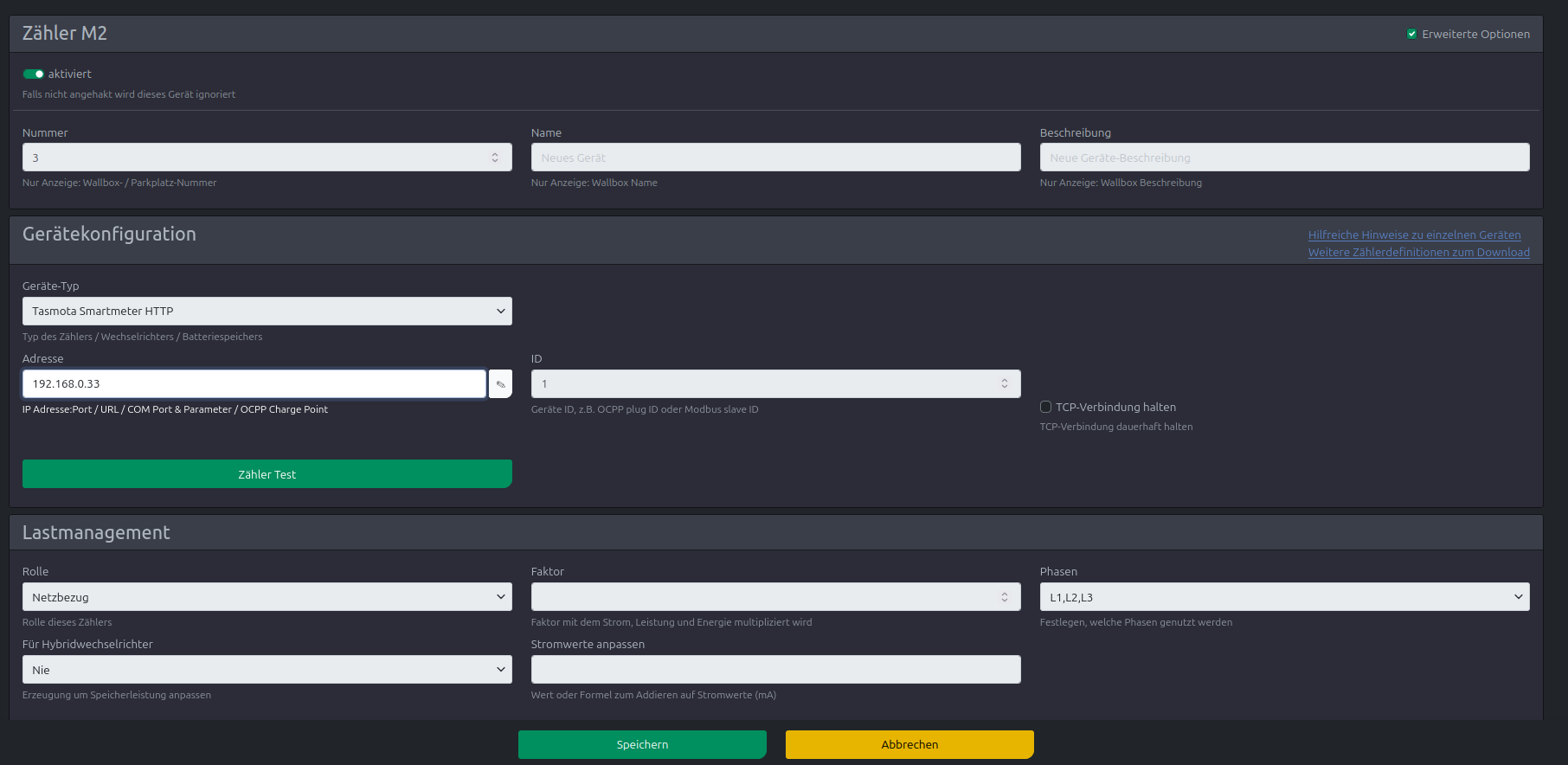 Er gibt mir nun den gesamten Verbrauch, gesamte Einspeisung und akt. Leistung aus – positv bei Bezug, negativ bei Einspeisung, so sollte es ja sein, oder? {"StatusSNS":{"Time":"2025-10-14T17:04:06","PICUS":{"E_in":12626.495,"E_out":1048.856,"power":5936}}} Nun habe ich versucht, in cFos eine Zählerkachel anzulegen, entgegen einiger Bilder die ich hier auf meiner Suche nach Informationen gefunden habe, kann ich unter Gerätekonfiguration den Geräte-Typ „Tasmota“ nicht wählen – ich hab es mal über „SML-Zähler / optische Leseköpfe via HTTP“ versucht, aber da kommt bei Zählertest: Version: 2.10.0 ESP Time: 2025-10-14 18:00:55 Device 'meter_sml_http': cFos,Meter SML HTTP,1.0,1.0,0 Address: http://192.168.178.60, Id: 1 COM errors: 1 Last error: No SML data Voltage: 0, 0, 0 Current: 0.000000, 0.000000, 0.000000 A Power: 0 W, 0 VA Import/Export: 0 Wh, 0 Wh heraus, also scheint das falsch zu sein. Oder ist mein Skript falsch? Oder habe ich komplett irgendwas falsch verstanden? Vielen Dank im Voraus für Eure Hilfe! RESOLVED