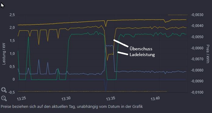 Ich hatte hier: beschrieben, dass der Laderegelsatz „PV surplus“ so nicht funktioniert und hatte einen Vorschlag zur Verbesserung gemacht. Dieser verwendet die Variable surplus_pcur. Wenn surplus_pcur einen verwertbaren Wert liefert, dann bitte mal den Laderegelsatz „Test Zeit (s), Regel weiter ausführen ohne erfüllte Bedingung bei Ueberschuss.json“ zum Überschussladen ausprobieren und prüfen, ob bei Unterschreitung des relevanten Überschusses noch 300s weiter geladen wird oder ob der Ladevorgang wie bei mir, vgl. Anhang Diagramm 2 Laden Überbrückungszeit.jpg sofort nach dem Wegfall ausreichendem Überschusses unterbrochen wird. Wenn surplus_pcur bei Euch ebenfalls nur den Wert Null zurückliefert, dann bitte den Laderegelsatz „Test_2 Zeit (s), Regel weiter ausführen ohne erfüllte Bedingung bei Ueberschuss einphasig.json“ bzw. „Test_2 Zeit (s), Regel weiter ausführen ohne erfüllte Bedingung bei Ueberschuss dreiphasig.json“ zum Überschussladen ausprobieren. Idealerweise wegen der Vergleichbarkeit mit der aktuellen Version 2.12.7 testen.