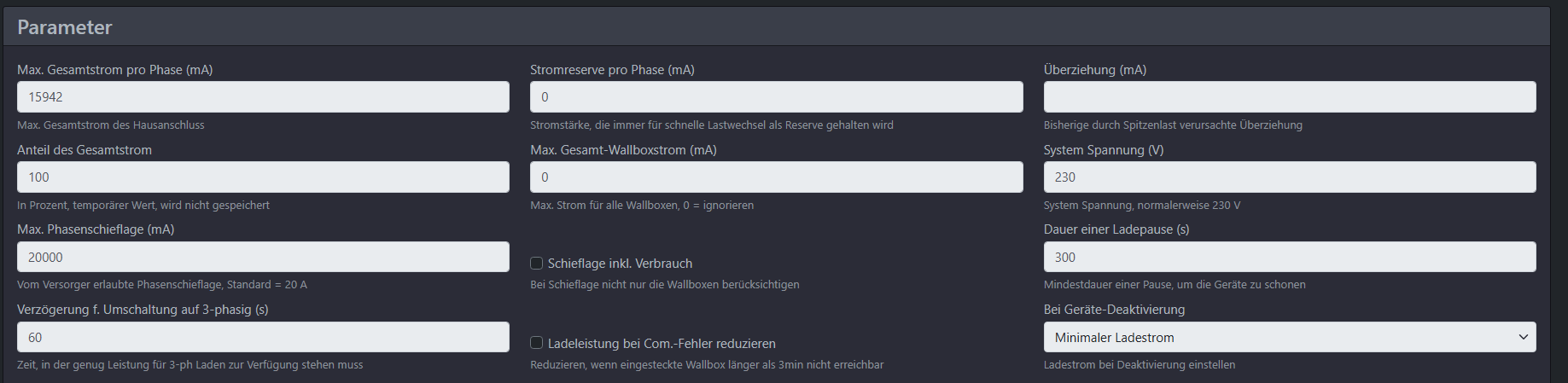 "Stromreserve pro Phase (mA)" und "Max. Gesamt-Wallboxstrom (mA)" kann auf 0 bleiben.