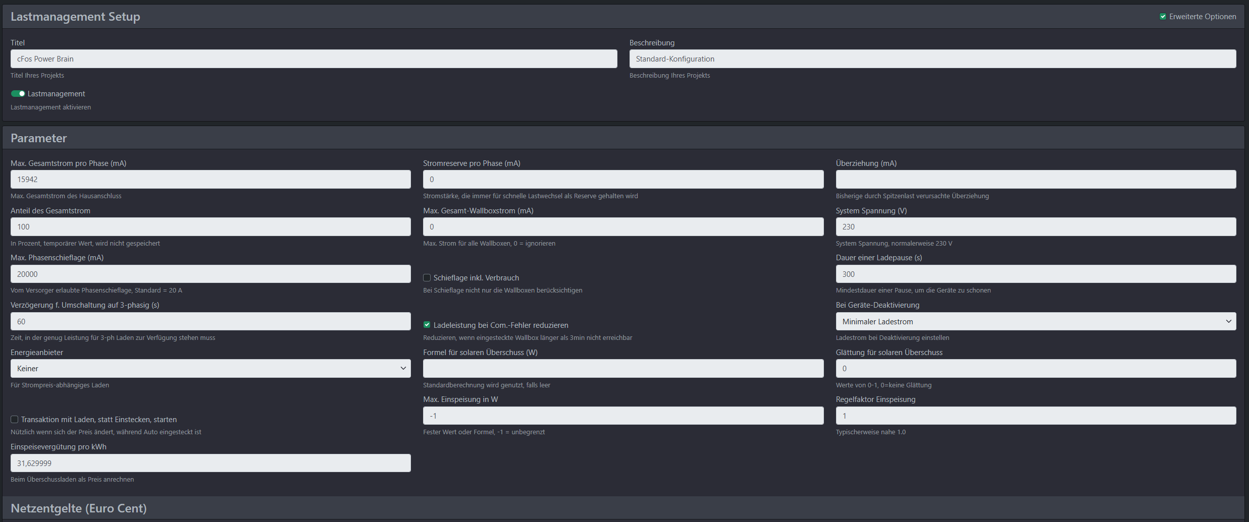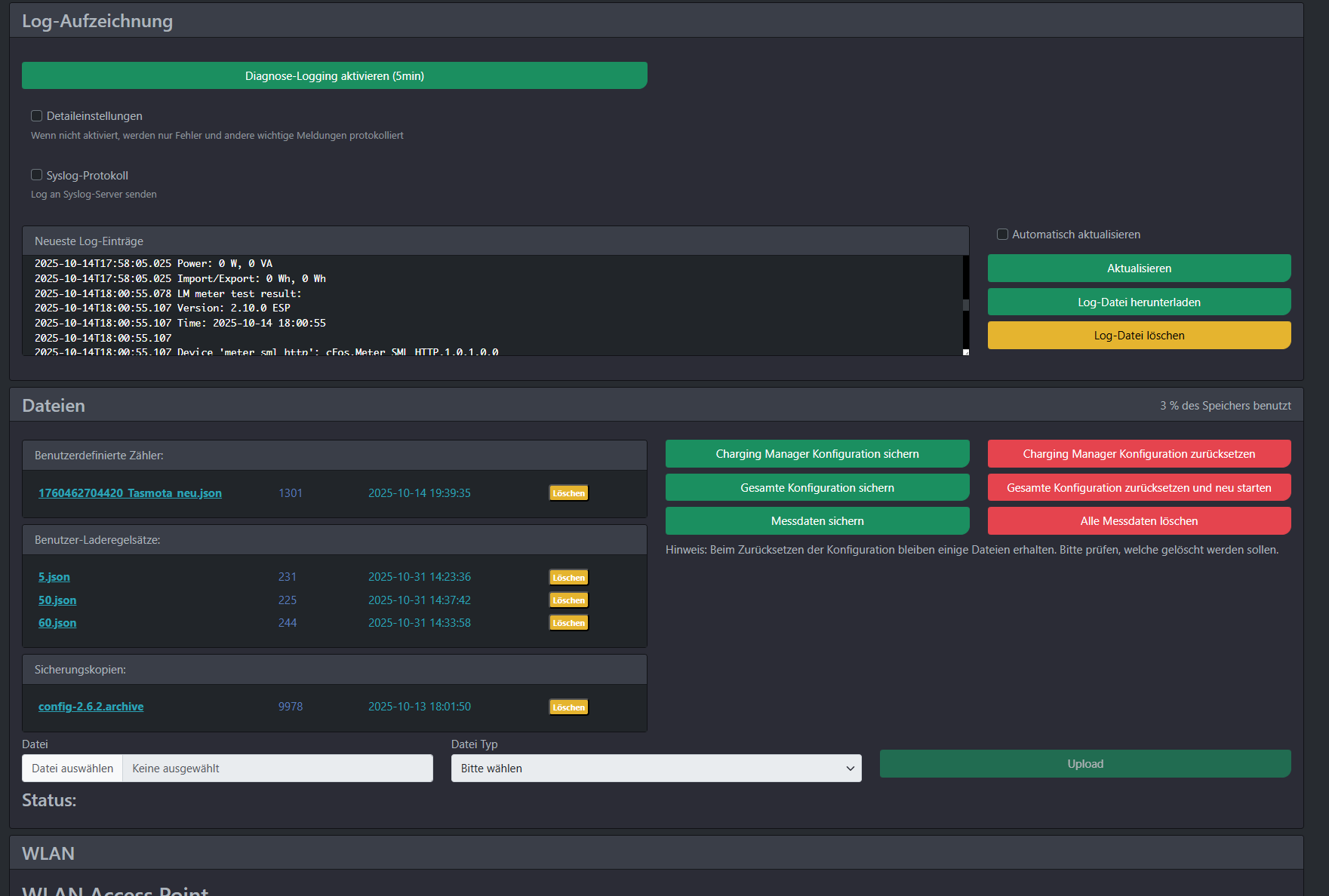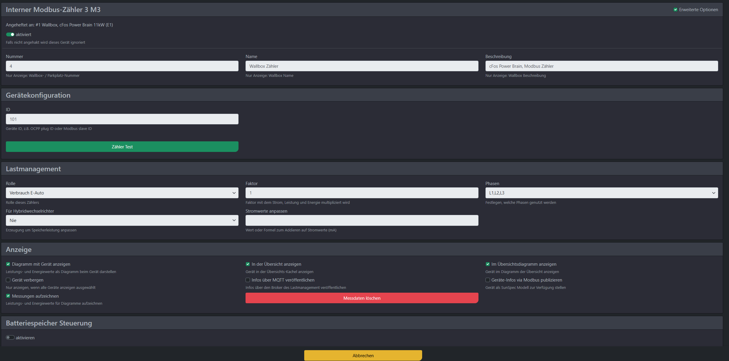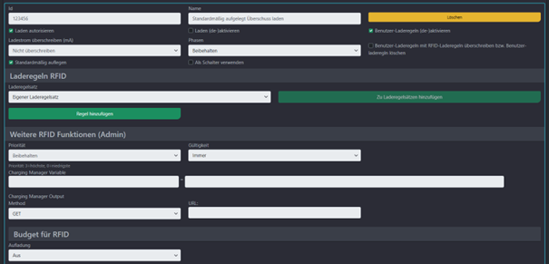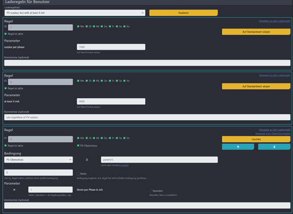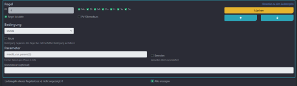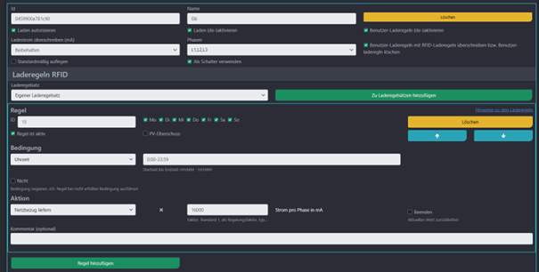 Servus, entschuldigt bitte die Flut an Anfragen – aber ich bin leider immer noch nicht am Ziel meiner Einstellungen. Zwei Punkte, die ich momentan immer noch nicht lösen kann: 1) Mein Ziel ist, maximal viel Solarstrom ins Fahrzeug statt ins Netz zu laden, auch wenn ich dabei zusätzlich Strom aus dem Netz ziehe. Im Sommer werde ich das umstellen, aber so lädt er aktuell sobald 500W Überschuss vorhanden sind mit 1,8kW los, und sollte das um 16 Uhr beenden. Dazu habe ich in den Wallbox-Einstellungen „Eigener Laderegelsatz“ und die feste RFID meines angelegten Benutzers hinterlegt. Dem Benutzer habe ich die Laderegeln „PV surplus, but with at least X mA“ zugewiesen, Bild 1 und 2 zeigen die 4 Regeln, die damit hinterlegt werden. Angepasst habe ich in Regel 1 „surplus per phase“ auf 1500mA, damit er früh startet, in Regel 2 „at least 6000 mA“ damit er mit mindestens 1,8kW lädt. In Regel 4 hätte ich gerne statt „immer“ die Zeit zwischen 9 und 16 Uhr hinterlegt – aber das speichert er nicht. Entweder da ist ein Bug, oder das beißt sich mit den Parametern. Kann ich hier einfach noch eine Regel hinzufügen, die um 16 Uhr beendet? Oder wie kann ich die Benutzerregeln so abändern, dass sie um 16 Uhr beenden? Ich habe eine „fiktive Karte“ hinterlegt, die habe ich 12345 genannt. Bild 3 zeigt die Einstellungen. Das funktioniert, er beginnt mit Überschuss und lädt dann mit 1,8kW einphasig und auf 8A begrenzt – ob er da drüber geht weiß ich nicht, es gab noch nicht mehr als 2kW während das Fahrzeug eingesteckt war. Nur hört er um 16 Uhr halt nicht auf. 2) Wenn ich mal ins Büro oder zu einem Termin fahre, soll das Auto in der früh 100% aufgeladen sein – deshalb habe ich dem Benutzer eine physische Karte hinterlegt, die die Benutzerladeregeln (Bild 4) überschreiben soll und mir mit 11kW den Akku vollballert. Die Karte funktioniert auch, zumindest lässt sich mit ihr ein Ladevorgang aktivieren und deaktivieren. Aber er lädt ebenfalls nur mit 1,8kW, 8A einphasig. Danke!