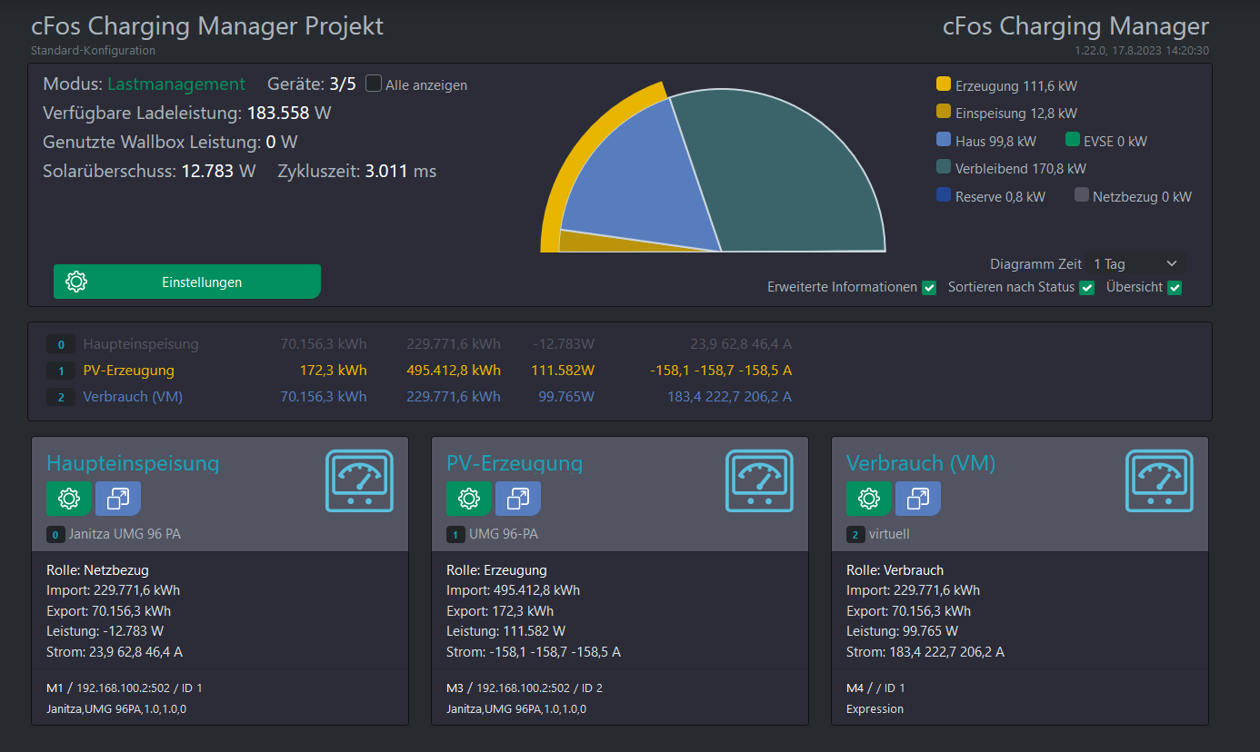 Hallo, ich bin gerade dabei den Charging Manager zu testen und habe folgende Situation. Eine Messung am Netzanschluss und eine Messung an der PV-Anlage. Eine Wallbox ist bestellt aber noch nicht verbaut. Für ein PV-Überschussladen sollte die Messung am Netzanschlusspunkt zwar ausreichen, ich würde allerdings die anderen Werte gerne mit angezeigt bekommen. Daher habe ich folgenden Ansatz gewählt: Netzanschluss: Rolle Anzeige PV: Rolle Erzeugung Virtueller Zähler (Netzanschluss – PV): Rolle Verbrauch Bei den einzelnen Zählern werden die Werte: Netzanschluss, Erzeugung und Verbrauch richtig angezeigt. Beim Tortendiagramm wird als Netzbezug allerdings Verbrauch – ABS(PV) gerechnet und der Netzbezug inkl. Diagramm stimmt nicht. Oder habe ich hier irgendwie einen Denkfehler RESOLVED