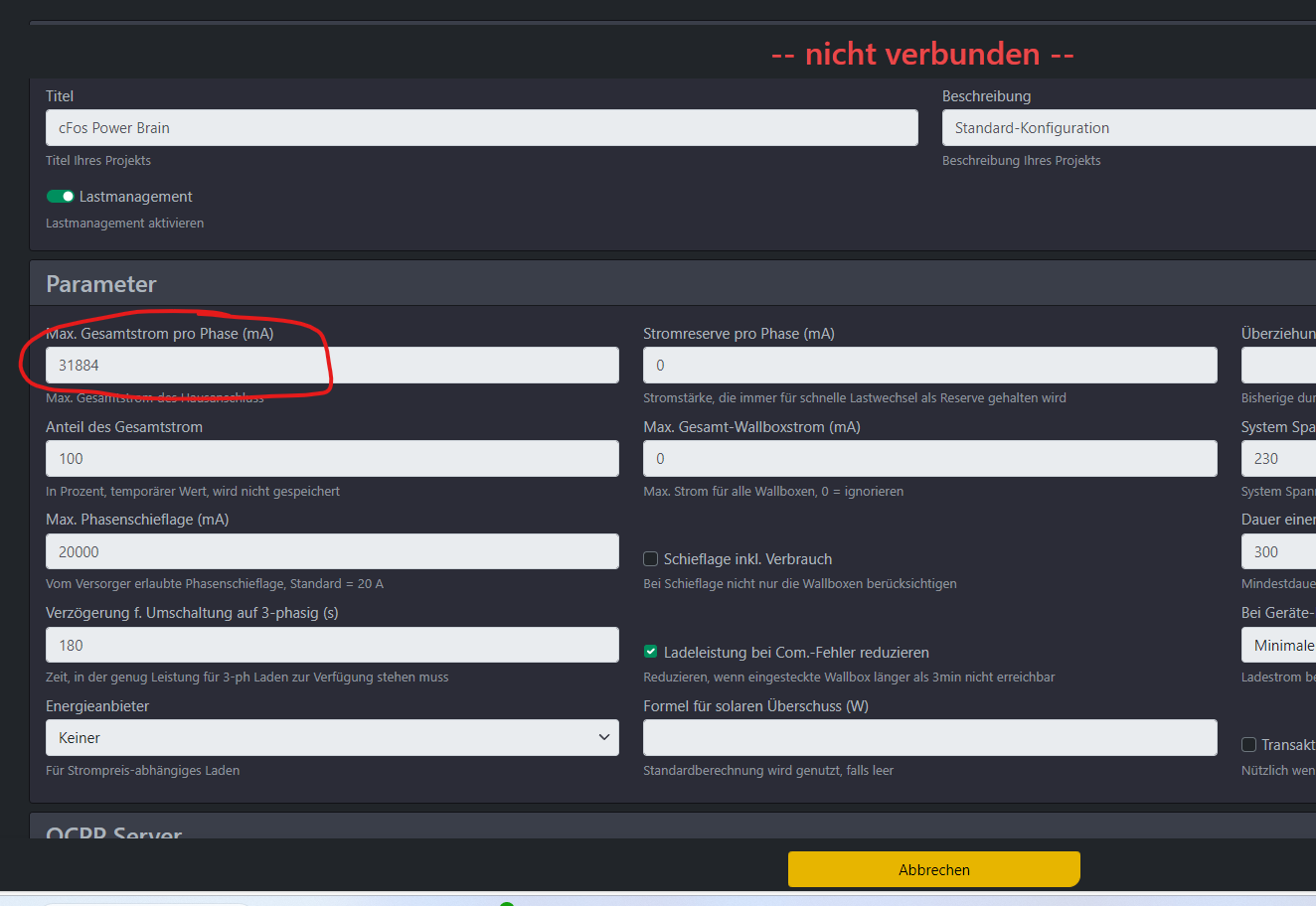 ich habe einen SolarEdge SE8K-RWS48BEN4. Ja, es passt etwas nicht. Die Werte, die der SE-Monitor zeigt, wichen (stark) von denen des PowerBrain ab. Ich hab SunSpec StartRegister 40083 eingestellt. Ich hab gestern den Faktor auf 6 gesetzt, dann sah es zunächst gut aus (die aktuelle Leistung). Jetzt wird mir allerdings bei Import 680kWh angezeigt. So viel hat der WR insgesamt noch nicht erzeugt. Den Satz "Im Lastmanagement sollte man den Strom des SLS (Zählervorsicherung) als "Max. Gesamtstrom pro Phase (mA)" eintragen." verstehe ich nicht. Wo soll ich das eintragen?
