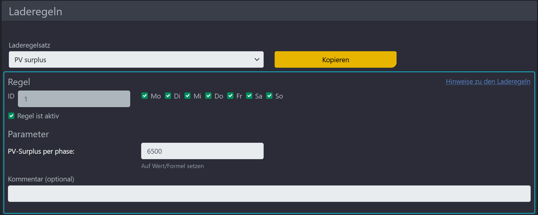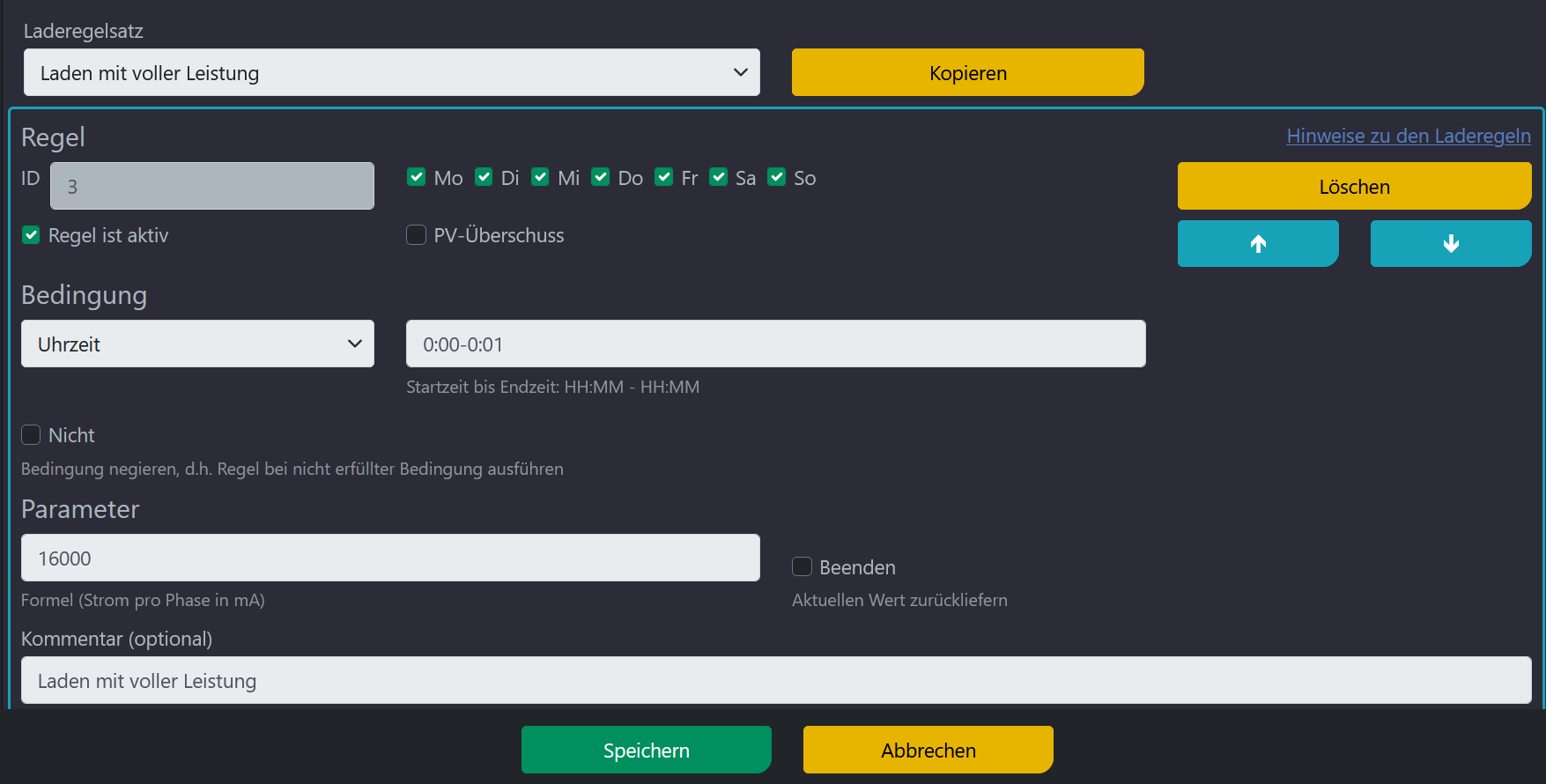 Da im Winter der PV-Strom nicht reicht habe ich dann zusätzlich eine Laderegel mit der Bezeichnung „Laden mit voller Leistung“ angelegt. Auch das hat funktioniert.